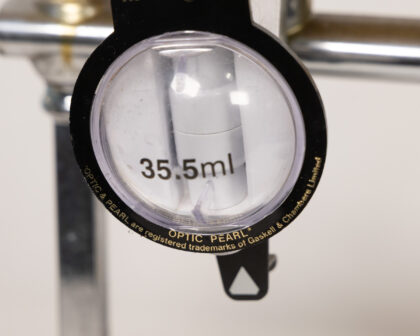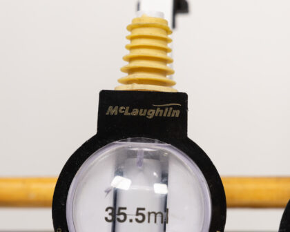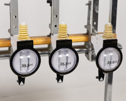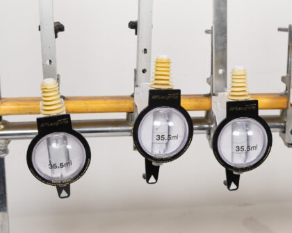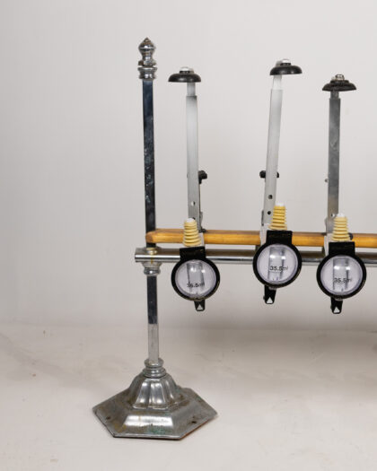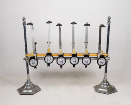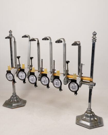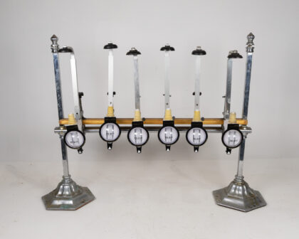 Vintage optic spirit dispenser featuring six meticulously crafted spouts. Each spout delivers a precise 35.5ml measure. Mounted on sturdy, ornate metal stands with a distinctive vintage patina. A unique piece of barware ideal for the home bar or collector. Minor wear consistent with age.