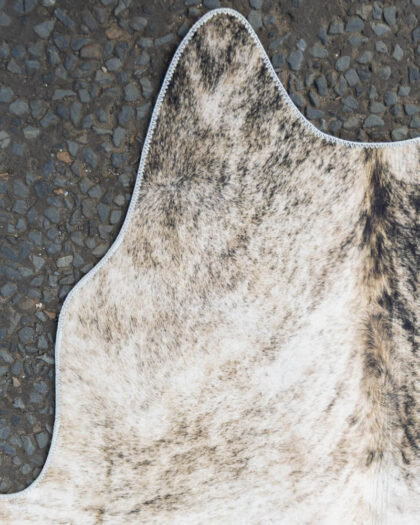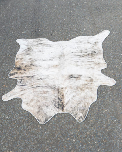 This is a cowhide-style printed fabric rug, perfect for adding a rustic touch to any home. The rug features a primarily white base with a natural cowhide pattern, including brown and black markings and spots that mimic the look of real cowhide. A white stitched edging surrounds the entire rug, providing a clean and finished appearance. The rug is made of woven fabric.