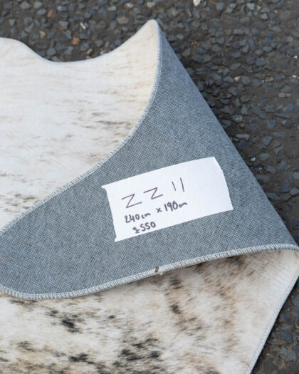 Cowhide style rug. White and brown colour with black markings. White edging, woven fabric. Approx 240cm x 190cm. Good condition.