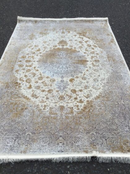 Sumptuous cream and gold ground full pile fine woven Persian carpet featuring medallion design with vintage look.