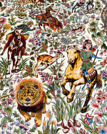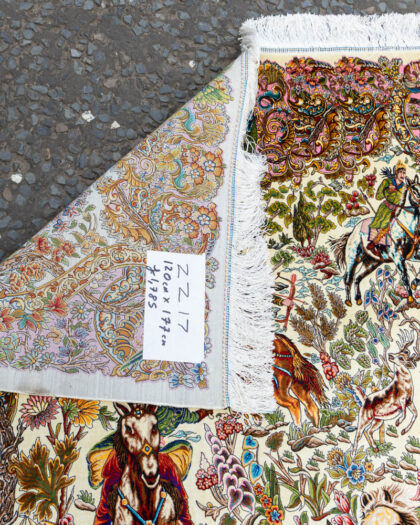 Cream Persian-style wool rug featuring hunting scenes with animals and figures. Intricate floral borders. Very good condition.