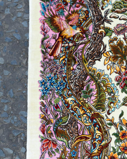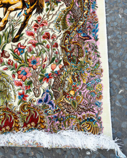 This is a contemporary Persian-style rug crafted from silk. The design features a hunting scene with various animals, including lions, deer, horses, and figures on horseback, all set amongst lush foliage and flowers. The border is intricately detailed with floral and vine patterns in shades of pink, blue, and green. The overall color palette is dominated by cream, providing a neutral backdrop for the vibrant details. In very good condition, perfect for adding a touch of traditional elegance to any room.