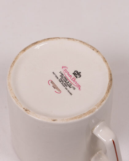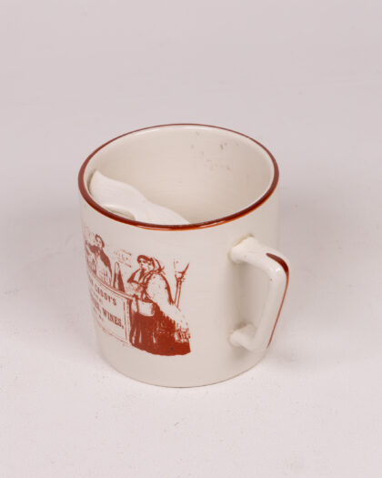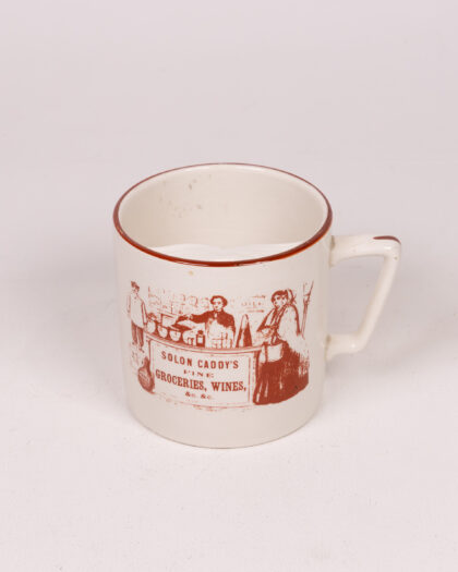 Vintage moustache Crown Devon ceramic mug featuring a Solon Caddy’s grocery advertisement. Perfect for collectors and vintage kitchen enthusiasts.