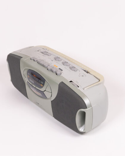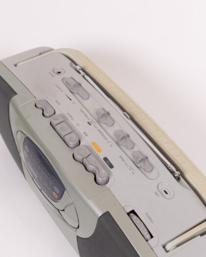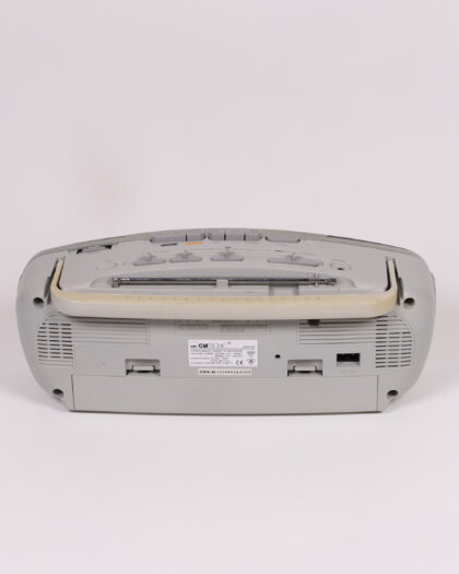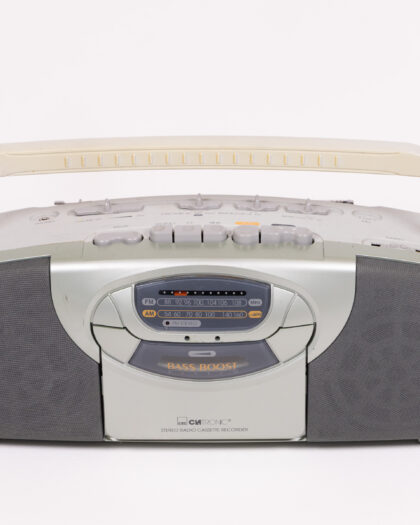 Vintage 'CTR Tronic' stereo radio cassette recorder. Primarily grey with black speaker covers and cream handle and details. Features include AM/FM radio and a cassette player. Controls are located on the top. The radio dial is clearly visible on the front. Serial number 32009990835DD on the back. A fun nostalgic piece.