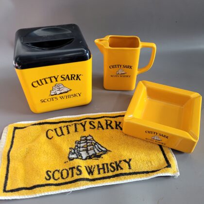 A Cutty Sark Scots Whisky branded jug, ashtray, ice bucket and towel.