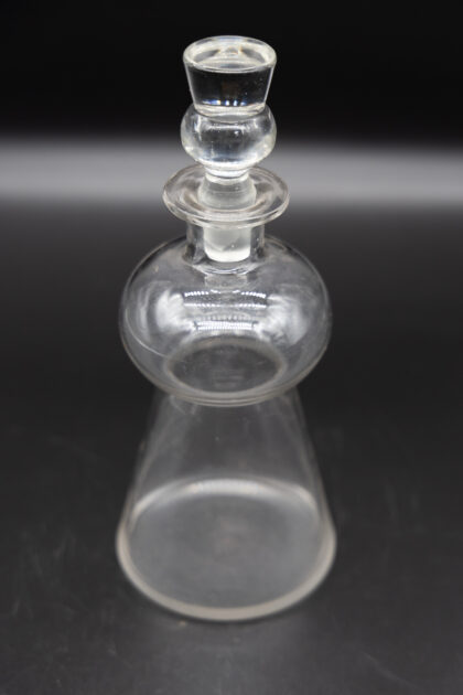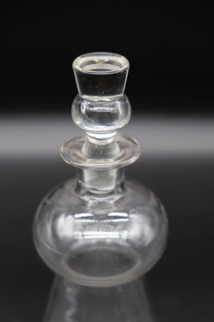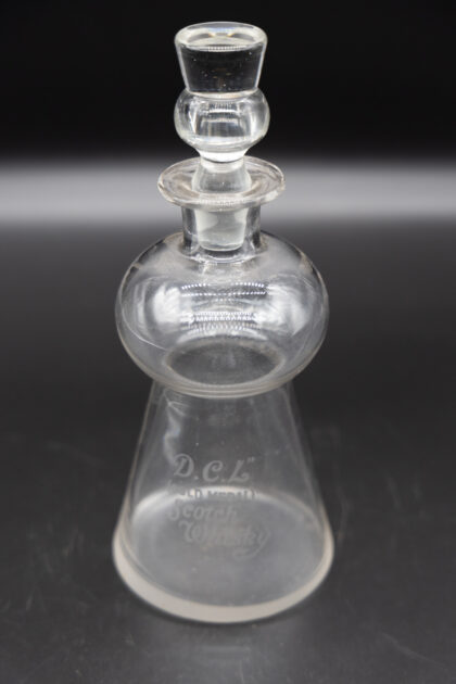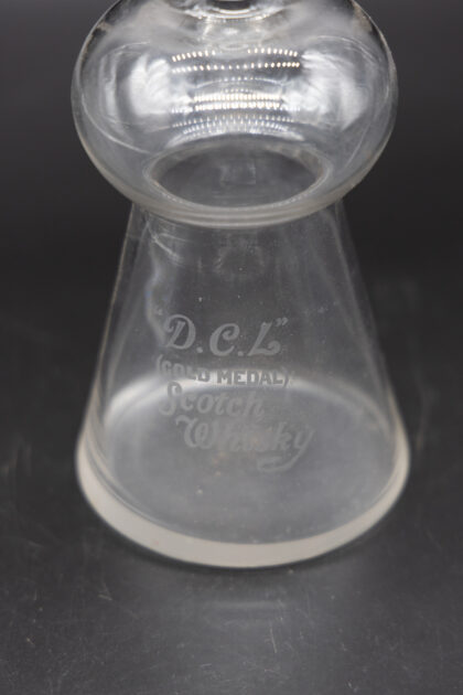 A glass decanter with lid and etched lettering for D.C.L Gold Medal Scotch Whisky.