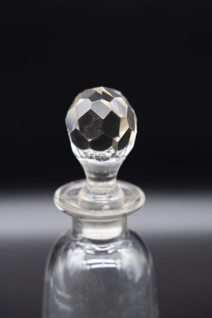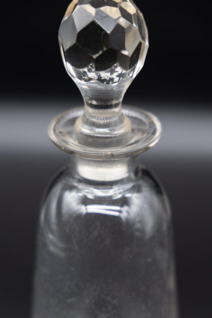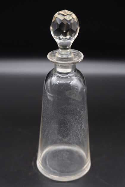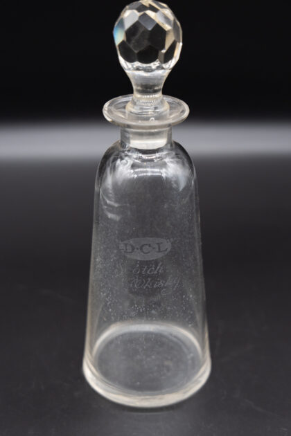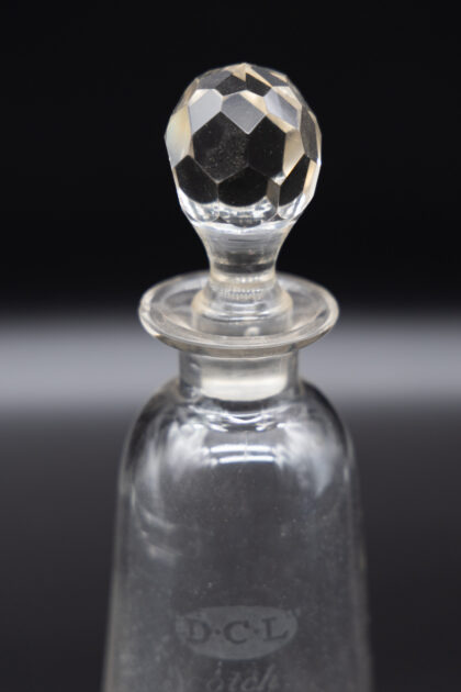 A glass decanter with lid and etched lettering for D.C.L Scotch Whisky. There is a small chip to the lip of the bottle.