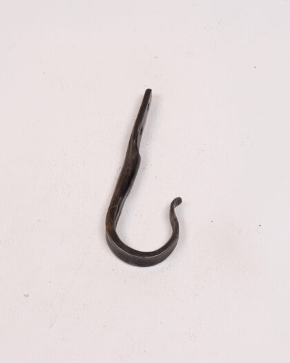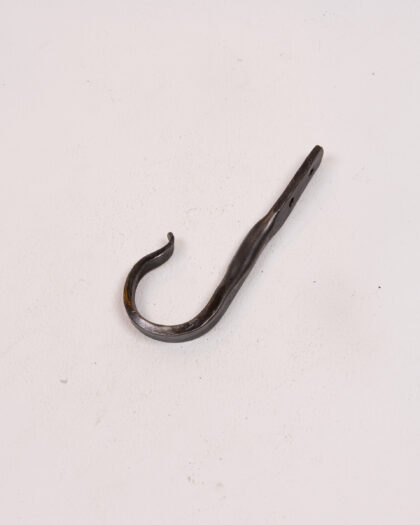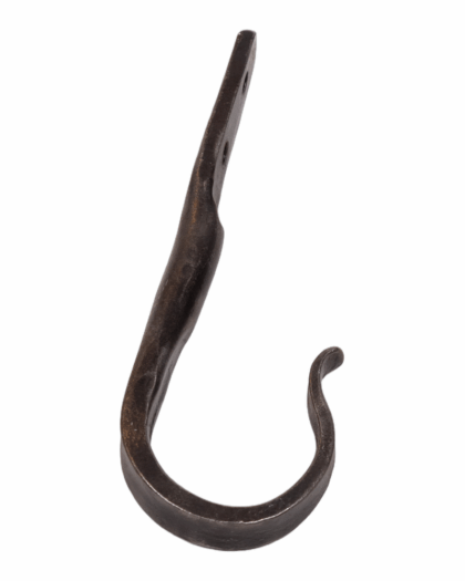This hand forged steel hook is made by Dalriada Forge and features a simple, curved design. The hook is suitable for a variety of uses around the home or in a garage. Its durable construction ensures it can hold a variety of items, from coats and hats to tools and garden equipment. The hook is in excellent condition, showcasing the craftsmanship of Dalriada Forge. A functional and decorative addition to any space, reflecting rustic charm and practical use.