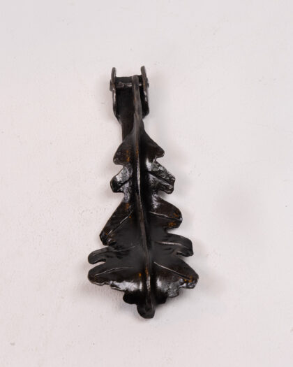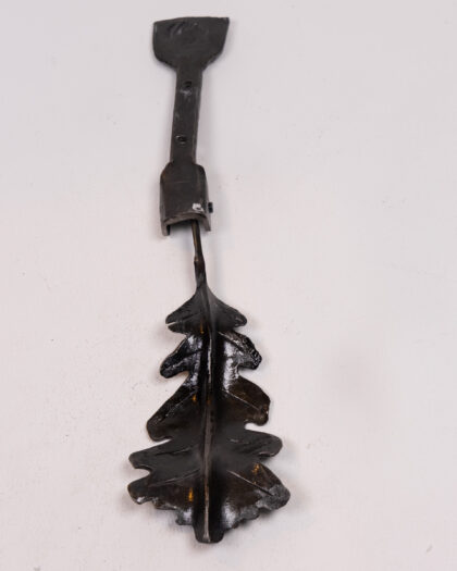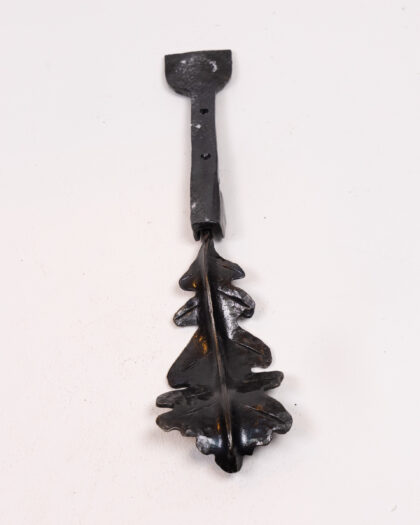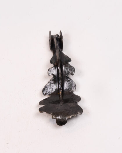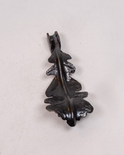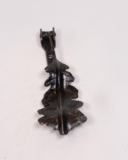 This is a stylish black metal door knocker created by Dalriada Forge. The knocker is in the shape of an oak leaf and is made from a heavy cast metal. It is in very good condition and would make a great addition to any home.