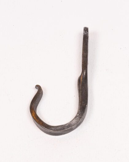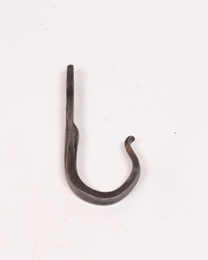 This is a hand-forged steel hook made by Dalriada Forge. The hook has a rustic, slightly rough finish, typical of hand-forged items. The hook is sturdy and suitable for hanging various items in a home, garage, or shed. The hook has been crafted with care, showcasing the artisan's skill and attention to detail. In excellent condition.