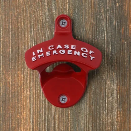 Add a touch of humour and functionality to your space with the Dapper Chap 'In Case of Emergency' Bottle Opener. This vibrant red opener is designed for wall mounting, making it a handy addition to any bar or kitchen. Includes all necessary screws and fittings for easy installation. Dimensions: Height 8cm x Width 6.5cm x Depth 3cm.