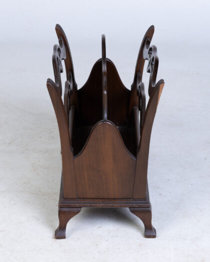 This is a vintage-style wooden magazine rack, ideal for storing magazines, newspapers, or documents. The rack is constructed from dark brown wood and features a three-section design with decorative cut-out details on the top and sides. It has four small cabriole legs. This rack combines functionality with a classic aesthetic, making it a great decorative and practical addition to a living room, study, or office. It appears to be in good condition.