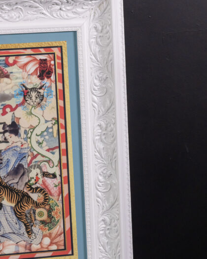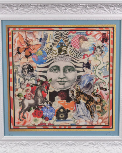 This framed print by Myrtle and Mary is a striking piece of wall art, featuring a colourful and intricate collage design. The artwork combines various images and patterns, creating a visually engaging and unique composition. The print is professionally framed in a white wooden frame with a gold coloured inner border and blue accent bordering the picture to enhance the overall aesthetic. The print is numbered and signed by the artist. The overall condition is excellent, making it ready to display and add character to any room in your home.