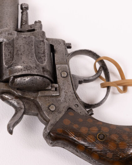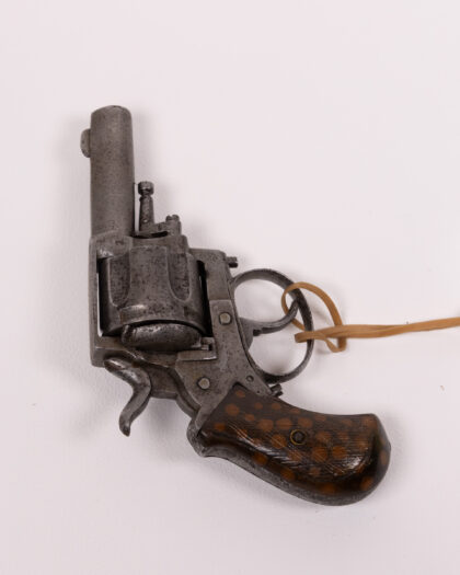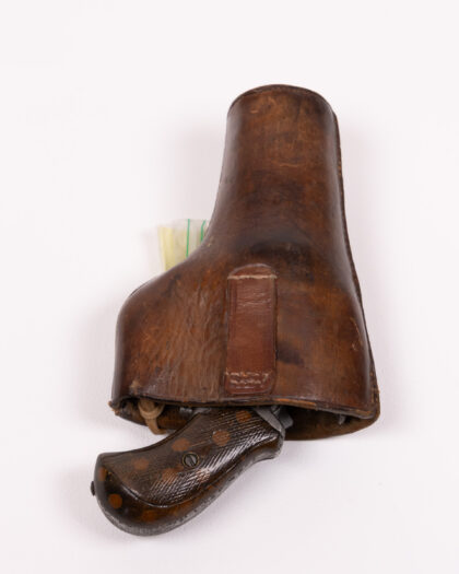 A deactivated antique-style Bulldog revolver with a leather holster. The revolver features a wooden handle, and a steel frame, cylinder, and barrel. The holster is made of brown leather and is designed to hold the revolver securely. The revolver has been deactivated to meet legal requirements, but it retains its original appearance and can be used for display or historical reenactments. The holster shows wear consistent with age. The revolver shows age and patina. Please note that as a deactivated firearm, it is sold as a collectible item and cannot be made functional.