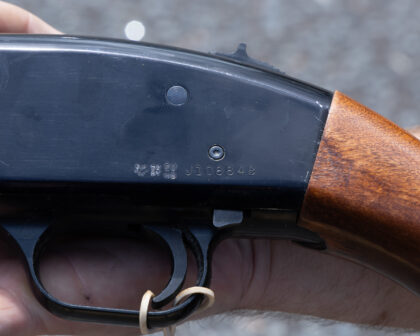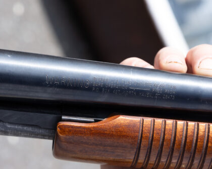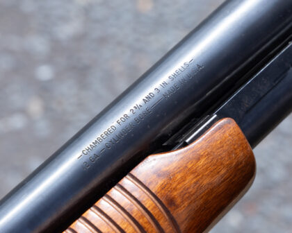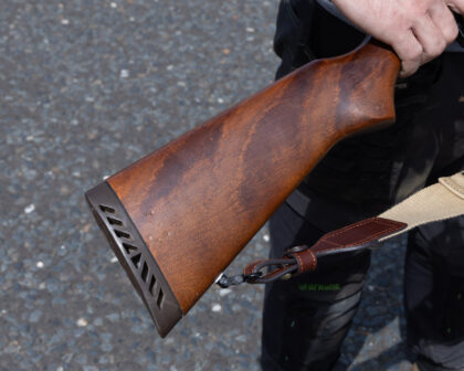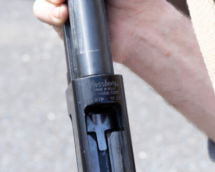Mossberg 500 ATP 12 GA Shotgun with wood stock, black metal finish and canvas sling. A great collectible for the firearms enthusiast.