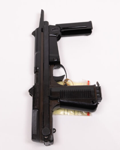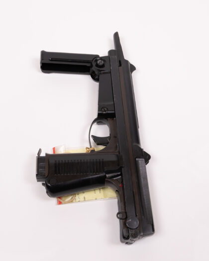 Deactivated PM-63 Polish Sub Machine Gun. In very good deactivated condition. Complete with magazine, correct holster, mag pouch, sling and oil bottle. Latest EU spec, with fully moving trigger, moving bolt, and removable magazine. The PM-63, or RAK (hand-held automatic commando firearm, in Polish), was introduced in 1965 and was intended as a light hand-held defensive weapon for rear-echelon soldiers such as gun crews and vehicle drivers. Small numbers of the weapon were exported to several Arab countries, Vietnam and the former East Germany, where the dreaded Stasi Secret Police and elite units of the DDR army made use of them. The Soviet KGB were also fond of it for covert tasks and hundreds found their way into the hands of terrorist organisations like the Red Brigades and Baader Mein Hoff, where the RAKs compact size and reasonably powerful 9mm Makarov ammo made them a favourite for urban guerrilla warfare and assassination. Most of the Terrorists at the Iranian Embassy Siege in London were armed with them as well.