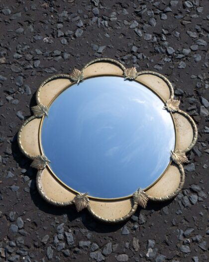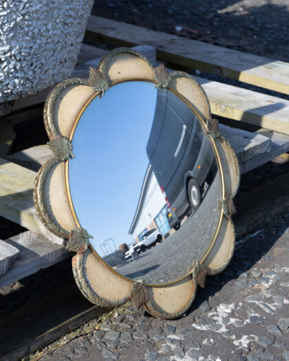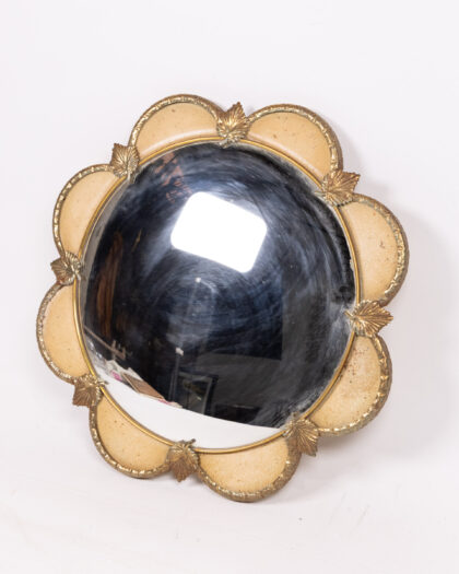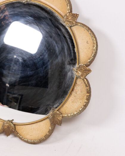 This decorative circular mirror features a frame with a cream-coloured base and gilded accents, including ornate leaf-like details. The frame is slightly aged but in good condition, adding to its vintage charm. A stylish addition to any room.
