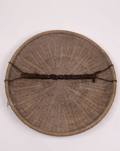 This is a woven bowl, possibly made of wicker or a similar natural material. The bowl is round with a woven pattern. The inside of the bowl has been painted in various colors and patterns. It has a green background with white and green detailing. The underside shows the natural woven material. It is in good condition overall.