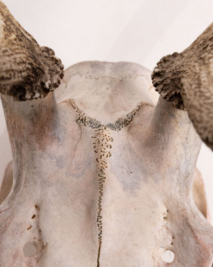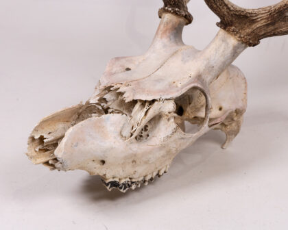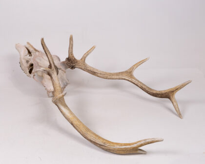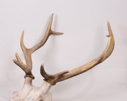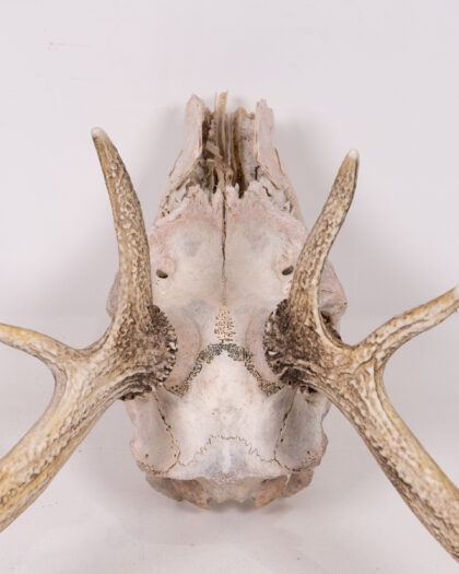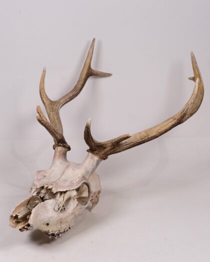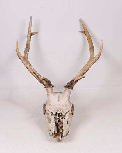 Real deer skull with antlers. A unique, rustic decorative piece for nature enthusiasts or as a striking home accent. Authentic weathered look.