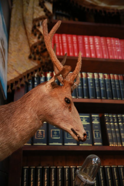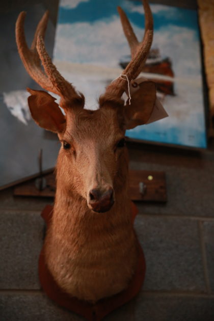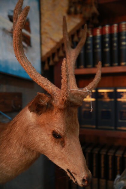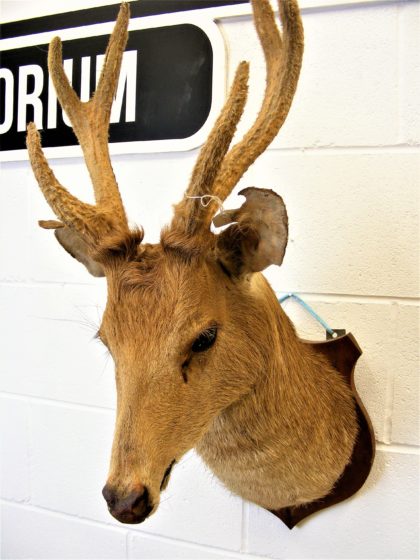 Charming vintage deer head trophy featuring unique felt antlers, mounted on a wooden plaque. A distinctive piece of wall decor for rustic or eclectic interiors.