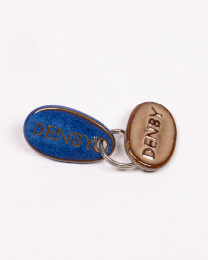 This is a Denby pottery keyring featuring two ceramic tags. One tag is blue and the other is brown. Both have the brand name 'DENBY' impressed onto them. The tags are attached to a metal keyring. The keyring is in good condition and would make a lovely gift for a Denby collector or anyone who appreciates vintage pottery.
