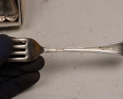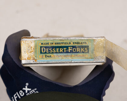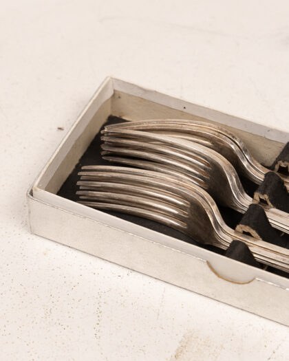 This is a boxed set of vintage dessert forks made by Derby & Sons in Sheffield, England. The forks are silver and feature a classic design. The box is original and shows some wear consistent with age, including some discoloration and tape. The forks appear to be in good condition, with some minor signs of use. A charming set for collectors or for adding a touch of vintage elegance to your table setting. The box is labelled 'Dessert Forks'.