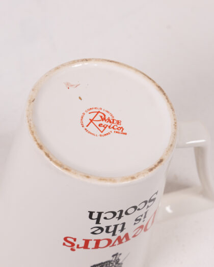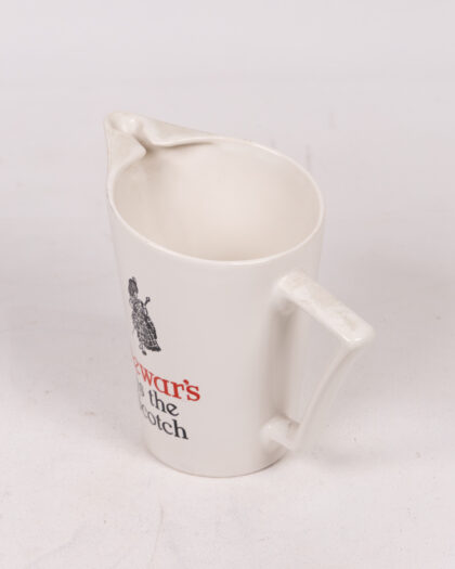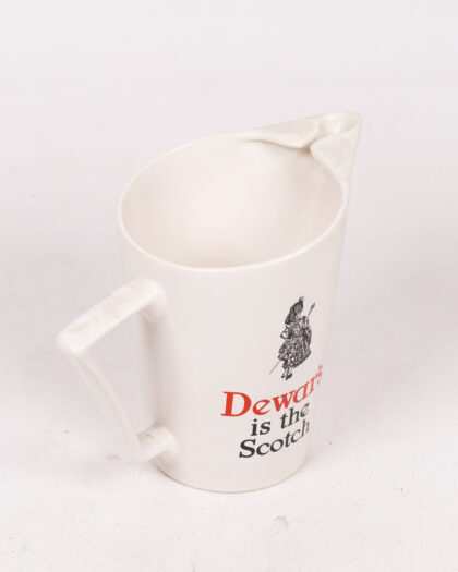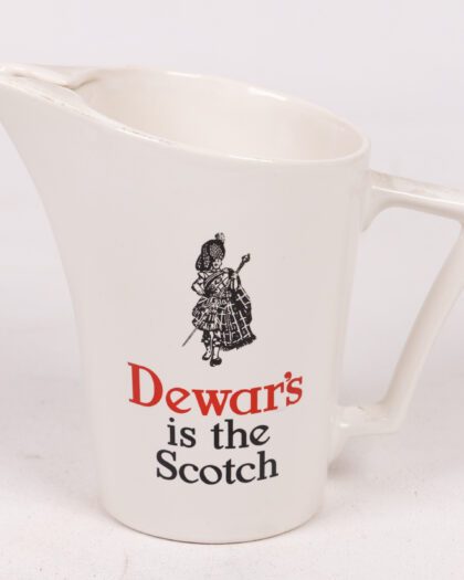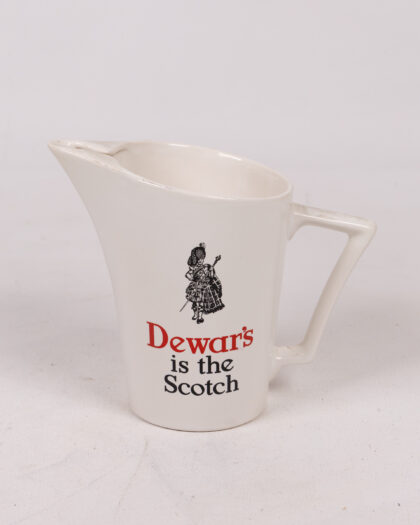 A ceramic jug with a spout and handle. This is a collectable item from Wade, for Dewar's Whisky. The jug is white with an image of a highlander and the slogan 'Dewar's is the Scotch' in black and red. It is marked on the base 'Wade, Redhill, Surrey, England'. This would make a lovely addition to a collection or decorative object in the home. There are some surface marks.
