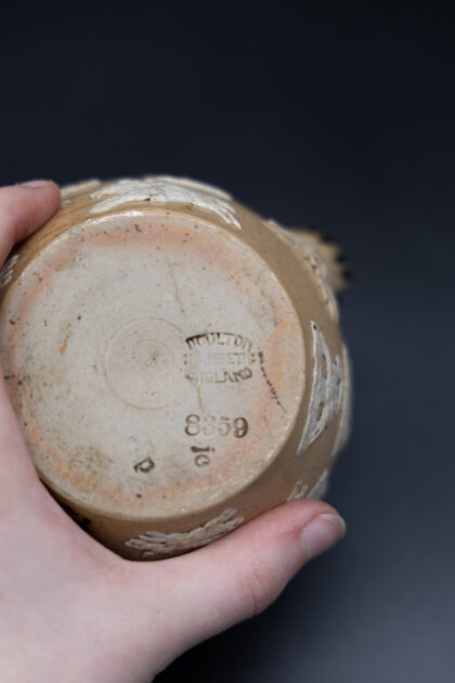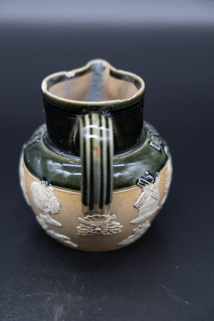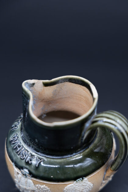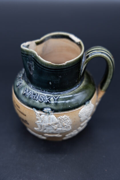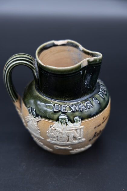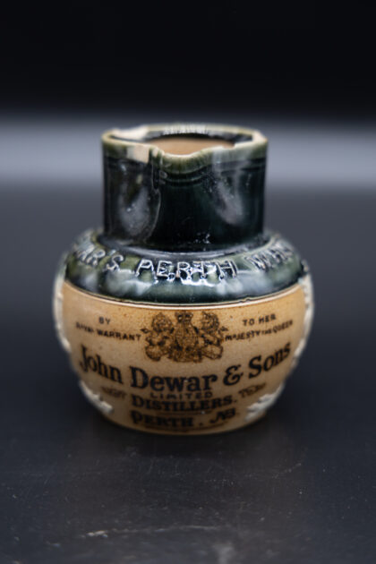 A stoneware jug for John Dewar & Sons Dewar's Perth Whisky. Made by Doulton Lambeth. Has several chips to the lip and spout.