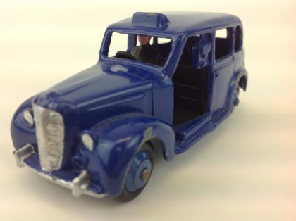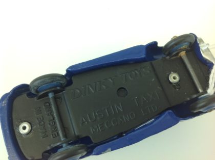 Dinky Austin Taxi made by Meccano (1934–64) ,die cast with black cast base plate. Painted in the original dark blue with silver detailing. The paintwork shows signs of wear from play but adds lots of character.