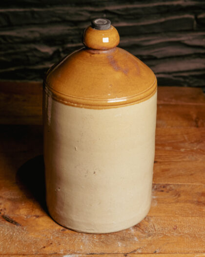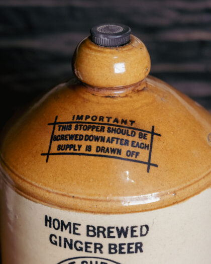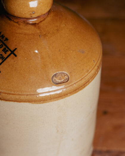 A large, glazed, two-tone stoneware flagon for Direct Supply Co. Ltd. Liverpool & Manchester Home Brewed Ginger Beer. Bears impressed Skey maker's mark.