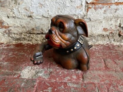 This unique cast iron dog moneybox makes a real impact. Cast from high-quality iron and carefully handpainted, it makes a perfect ornamental item for display on shelves, bookcases or tables. The dog is finished in handpainted dark brown, with lighter tones highlighting the details around its face and body. The dog is wearing a black collar with brass-coloured buckle and studs, and has red coloured lips. As a mechanical moneybox, the dog's arm is fully articulated, meaning that when you place a coin in its paw and pull the lever, the dog's arm moves to its mouth, depositing the coin inside for safe-keeping. This really is an eye-catching item, perfect both for display as an ornament in its own right, or also as a gift to younger people to teach them the value of saving.