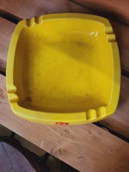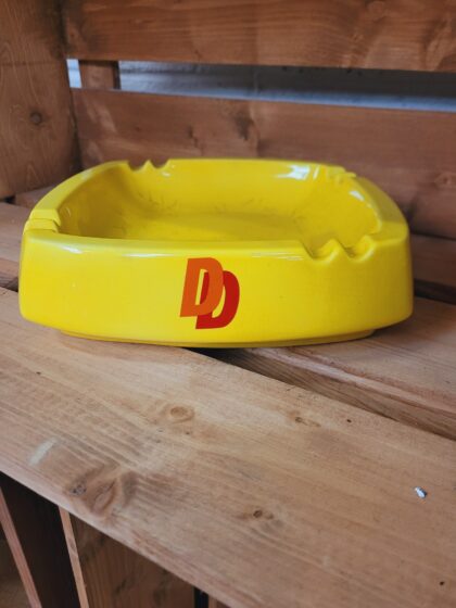 A yellow glazed ceramic ashtray. Bears red lettering which reads, "Double Diamond". Made by Henry W. King & Co. Ltd. and bears red backstamp to base.