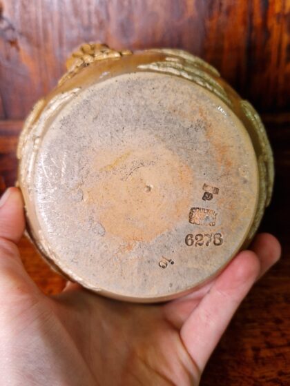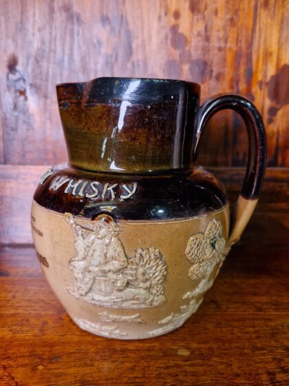 A stoneware jug for John Dewar & Sons Dewar’s Perth Whisky. Made by Doulton Lambeth. The letter W has been broken off.