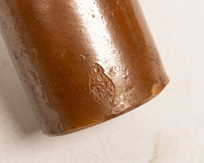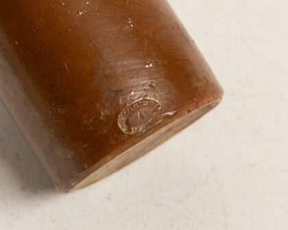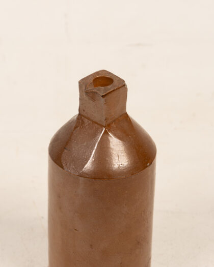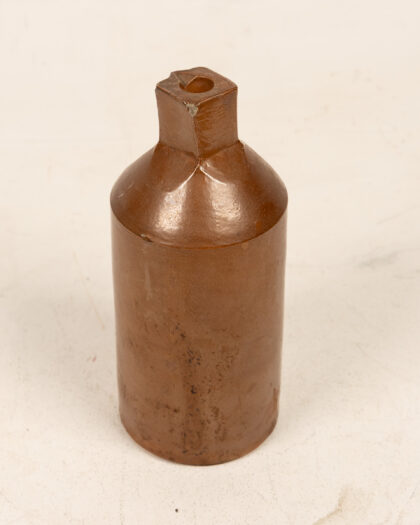 This is an antique Doulton Lambeth brown stoneware bottle. The bottle features a cylindrical body and a distinctive square opening at the top. The stoneware has a rich brown glaze. It shows signs of age with minor imperfections, adding to its vintage charm. The base features a maker's mark, indicating its authenticity. Ideal for collectors of antique bottles or stoneware.