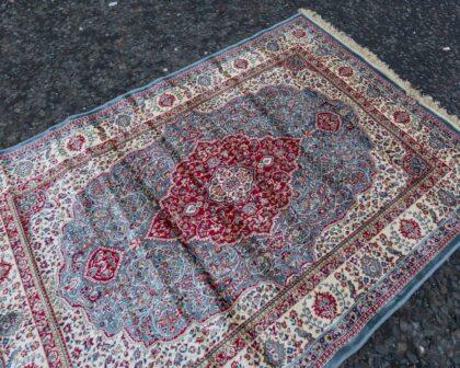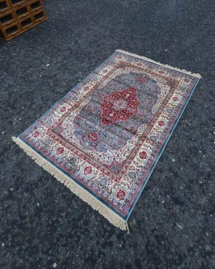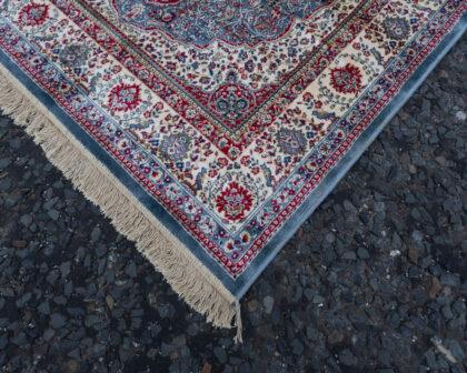 This elegant duck egg blue cashmere rug features a traditional floral medallion design.