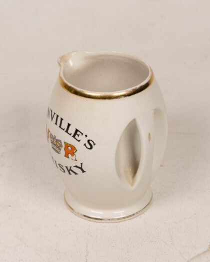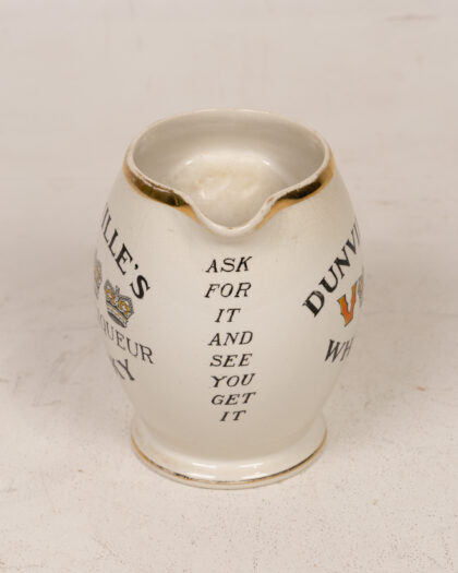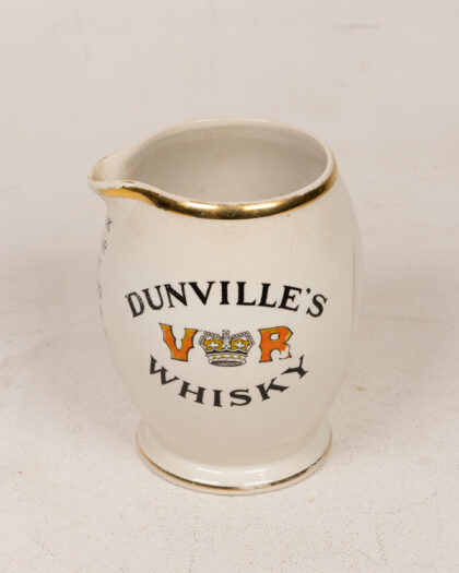 Vintage Dunville's Whisky advertising jug from Belfast pottery. Features gold trim and bold lettering. Great for collectors. Height approx. 13cm.