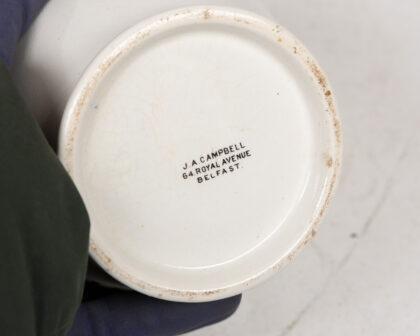 Vintage Dunville's Special Liqueur Whisky advertising jug. Made by J.A. Campbell, 64 Royal Avenue Belfast. It features gold trim around the rim and base, with black and orange lettering and crown logos. The jug also features the wording 'Ask for it and see you get it'. In good condition, with some minor wear to the gilt trim. Perfect for a collector of Irish whiskey memorabilia or vintage advertising items. 13.5cm high