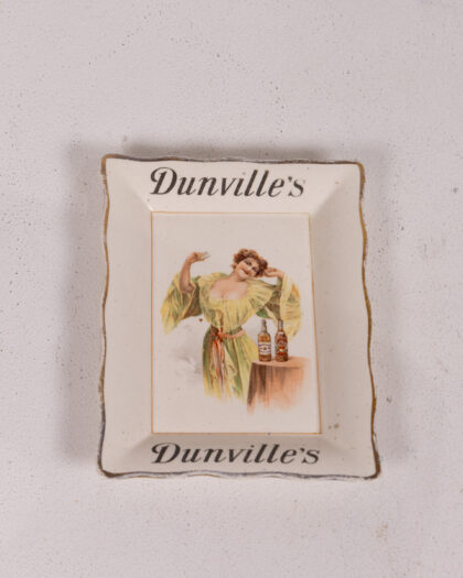 Dunville's Whiskey ceramic ashtray featuring a colour image of a woman beside 2 whiskey bottles. Belfast advertising history.