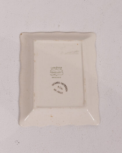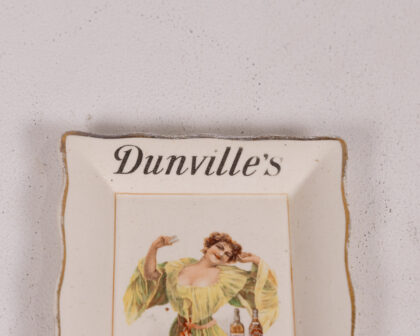 Dunville's Whiskey ceramic ashtray. Features a colour image of a woman in a yellow dress beside 2 bottles of the Belfast whiskey, from the distillery Dunville & Co. The dish is edged in gold trim. The bottom is marked 'Late Foley Shelley' and 'Richard Patterson & Co, Belfast'. The dish is in very good condition for its age, with only slight wear to the gold trim. A great piece of Irish advertising history.