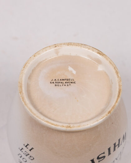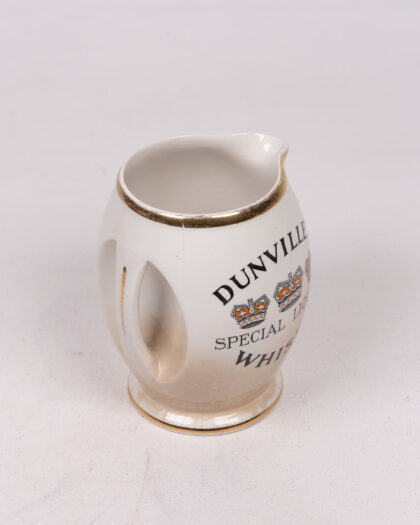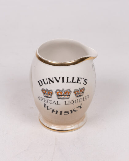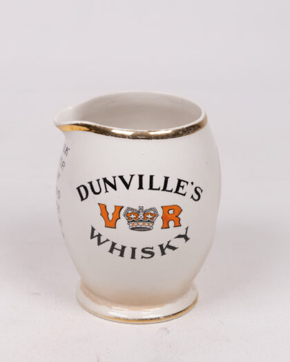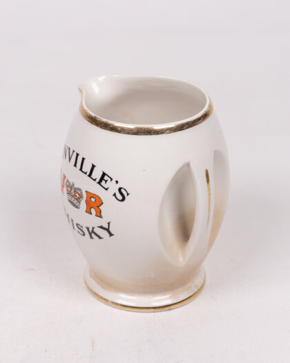 Dunville’s V.R. Whiskey jug. Ceramic with gold trim and logo design. Manufactured by J. A. Campbell, Belfast.