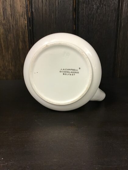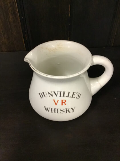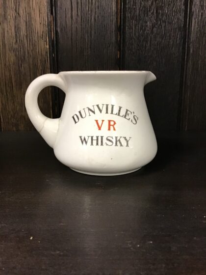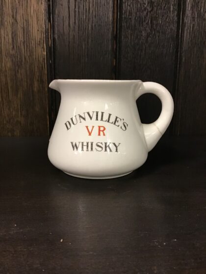 A white glazed ceramic Dunville's Whisky bartop water jug. Bears red "VR" markings and black text. Made by J. A. Campbell 64 Royal Avenue Belfast. Has a crack in the handle but has since been mended.