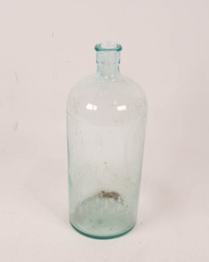This is an antique light blue glass bottle. It is an early 1900s lab bottle for acid. It features rounded shoulders, a cylindrical body, and a narrow neck with a simple lip. The glass is clear with a delicate blue tint.