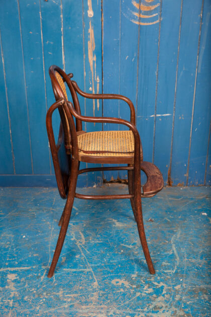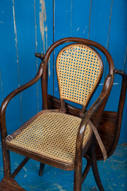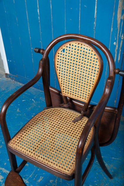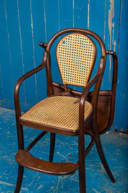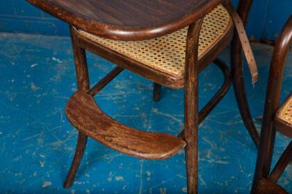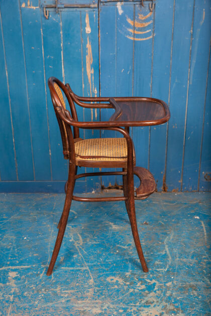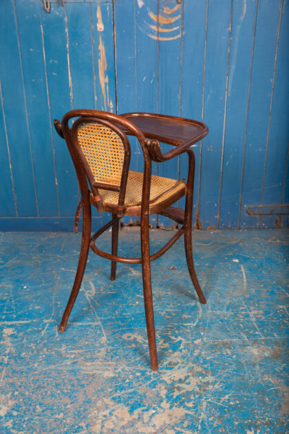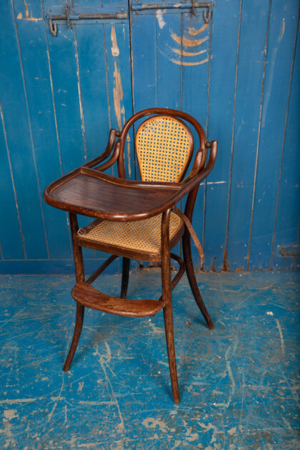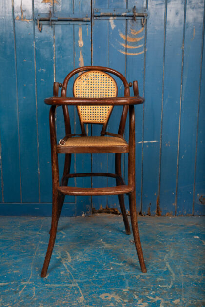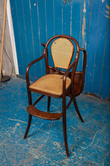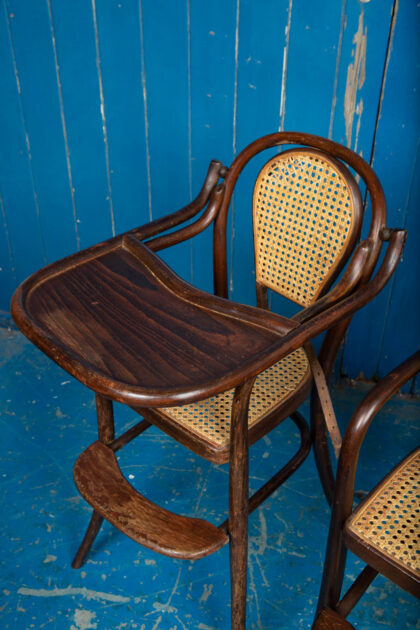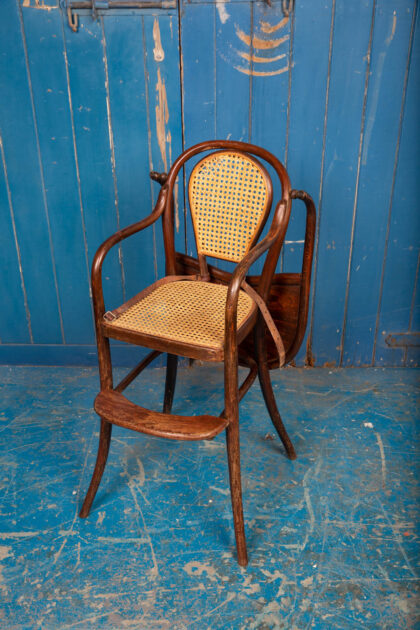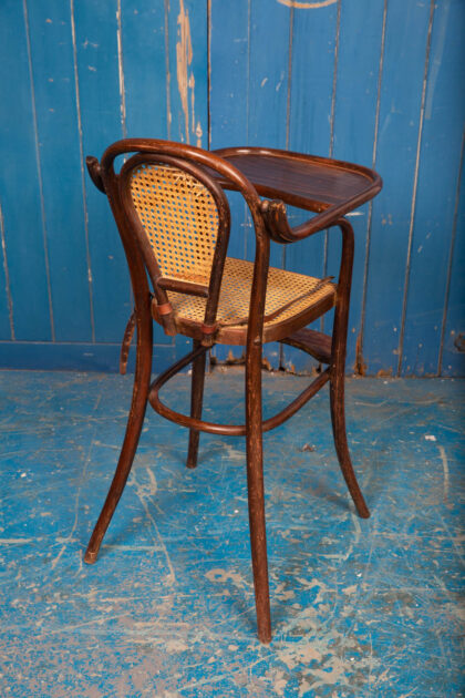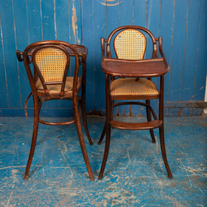 An interesting pair of early 1900s bentwood child's high chairs with rattan seating. Functional pieces with foot rest and folding food tray. One chair has the original leather restraining straps, the other has only partial straps. Rare to get them in good condition. There is some wear and tear but they are in good condition for their age and use. There is some minor damage to the rattan.