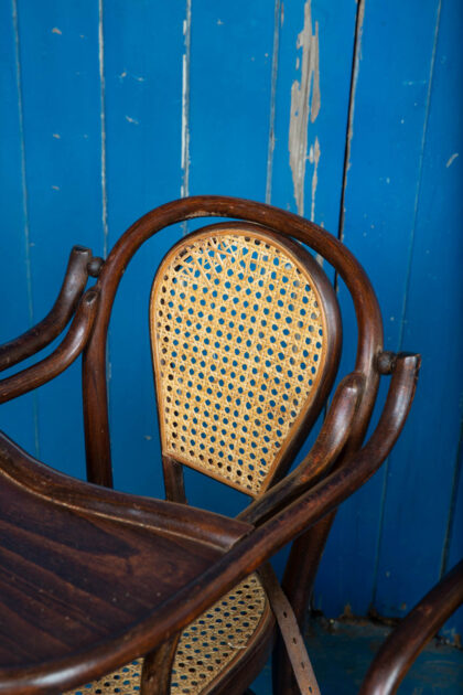 Bentwood objects are those made by wetting wood (either by soaking or by steaming), then bending it and letting it harden into curved shapes and patterns. In furniture making this method is often used in the production of rocking chairs, café chairs, and other light furniture. The iconic No.14 by Thonet is a well-known design based on the technique. The process is in widespread use for making casual and informal furniture of all types, particularly seating and table forms. It is also a popular technique in the worldwide production of furniture with frames made of heavy cane, which is commonly imported into European and western shops.