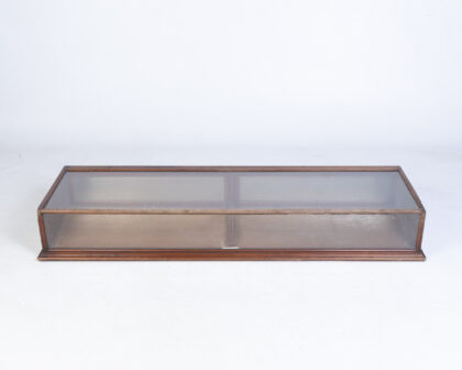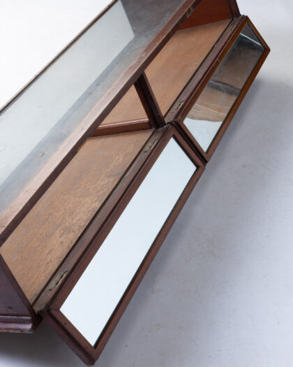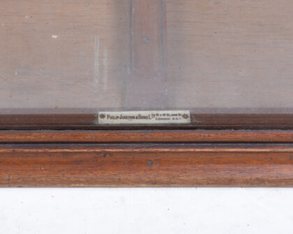 Early 20th century counter display cabinet by Philip Joseph & Sons. Features a glass top, allowing for excellent visibility of displayed items. The mahogany frame has a rich, warm tone with classic moulding detail. The cabinet opens from the back to reveal a mirrored interior. It bears a maker's mark plate, adding to its authenticity and collectibility. The cabinet would be ideal for retail display or for showcasing personal collections. Condition is good, with some signs of age and use commensurate with its vintage status.