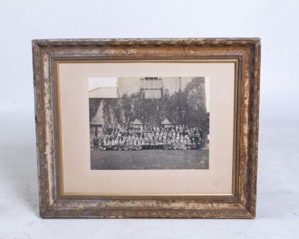 This is a framed photograph of a group of Freemasons, likely taken in the early 20th century. The photograph captures a formal gathering of men in Masonic attire, posing in front of a building covered in ivy. The image is black and white and is mounted on a neutral-toned card with a gold coloured trim. The frame itself is ornate, featuring a distressed finish with a mix of gold and brown tones. The frame shows signs of wear and age, adding to its vintage character. The overall condition of the photograph and frame is consistent with age, with some minor imperfections that do not detract from its historical appeal. The photograph is a fascinating piece of fraternal history, perfect for collectors of Masonic memorabilia or anyone interested in fraternal organisations.