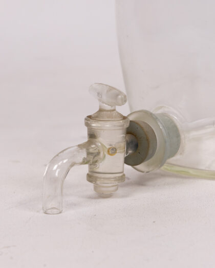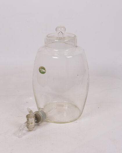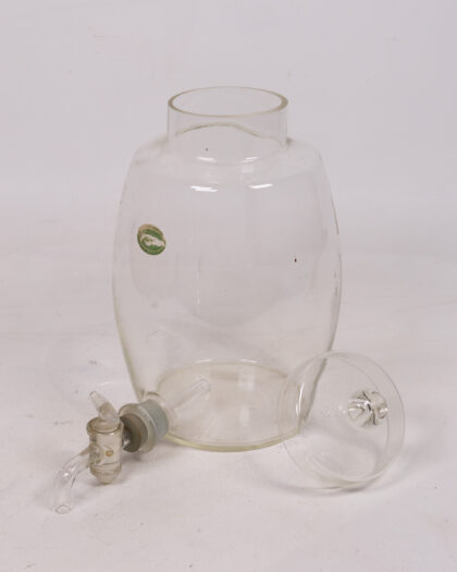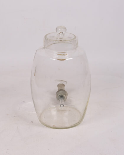 This is an early 20th-century glass whiskey dispenser, perfect for adding vintage charm to your home bar or collection. The dispenser features a clear glass body, a spigot for easy pouring, and a matching glass lid. It shows some signs of age, which adds to its authentic vintage appeal. Ideal for collectors or anyone looking to add a touch of history to their home decor.