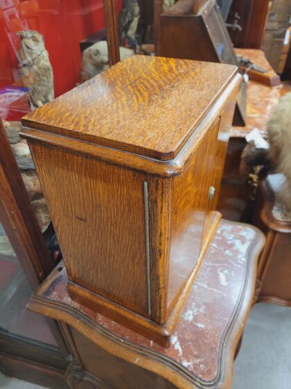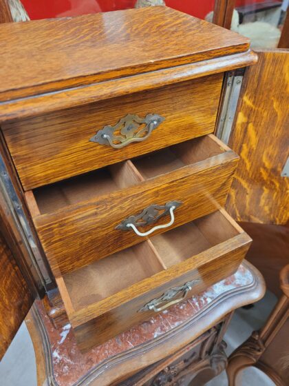 A small table cabinet with locking doors and three small drawers inside.