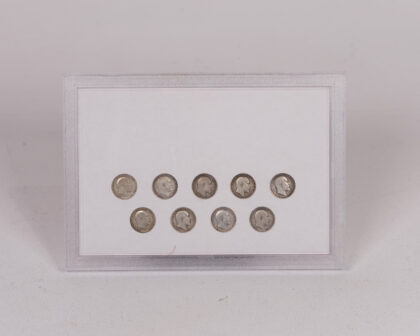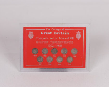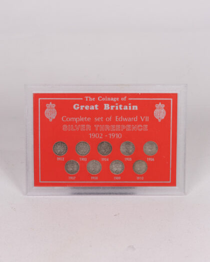 Complete set of Edward VII Silver Threepence coins, housed in a clear protective case with a red display card. The set includes coins from 1902, 1903, 1904, 1905, 1906, 1907, 1908, 1909 and 1910. The coins are in good condition for their age, with visible details and a pleasing patina. The display card features the Royal Coat of Arms. A great set for coin collectors.