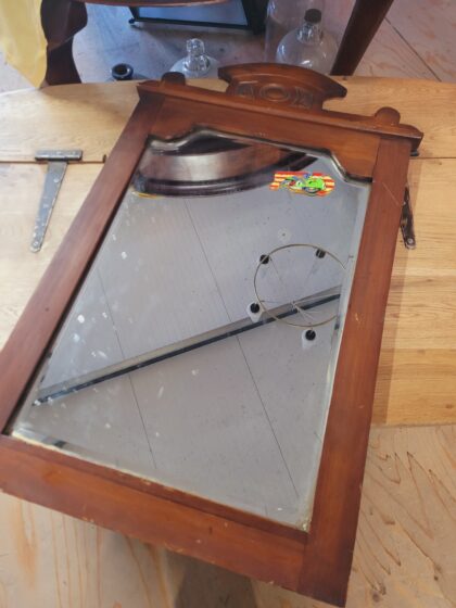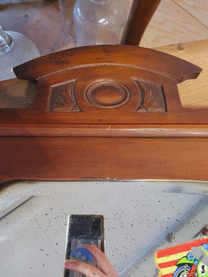 An Edwardian, wooden framed mirror with applied decal. This could probably be removed.